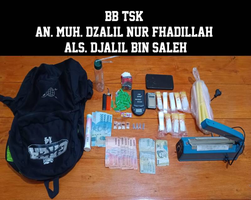 Selain itu, petugas turut mengamankan satu unit telepon genggam, timbangan digital, alat press plastik, pipet plastik, klip bening kosong, alat isap (bong), pireks kaca, uang tunai, serta barang lain yang diduga digunakan dalam aktivitas penyalahgunaan narkotika.