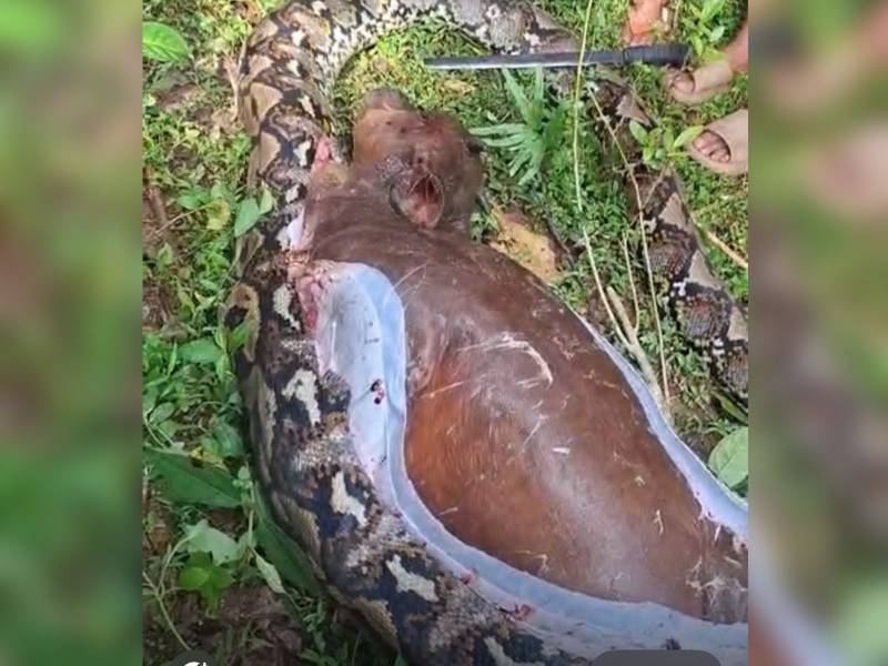 Ular piton ditemukan di area kebun dengan kondisi perut membesar. Warga kemudian membelah bagian perut ular tersebut untuk mengeluarkan sapi yang telah ditelan.